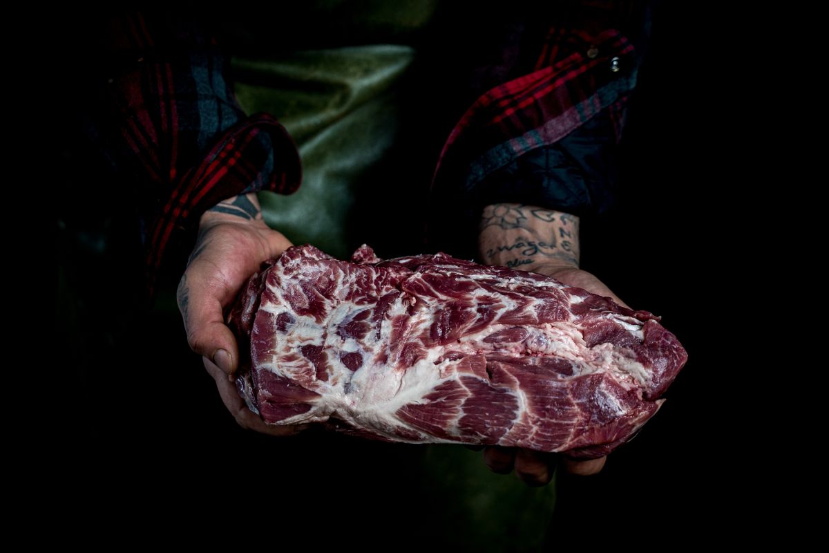 De varkensnek wordt gesneden uit het bovenste gedeelte van de hals